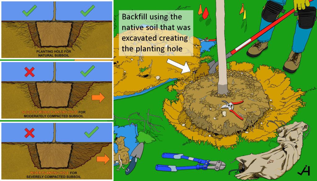 Planting in Compacted Soil will require excavating a wider hole. Break up the backfill soil to make it less compacted and encourage root establishment.