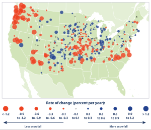 Data collected from nearly eight decades, since 1930, by the U.S. Environmental Protection Agency (EPA) indicates a change in total snowfall in the country. A warmer atmosphere can hold more moisture, but higher temperatures mean winter precipitation is more likely to fall as rain. In some cases, a cycle of drought can cause warmer soil to absorb more solar radiation, creating high pressure that further suppresses rain and exacerbates heat.