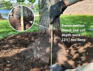 - Ensure proper depth by keeping the total mulch depth to a non-compacted 2″ to 4″, extending it out from the trunk based on the dripline.