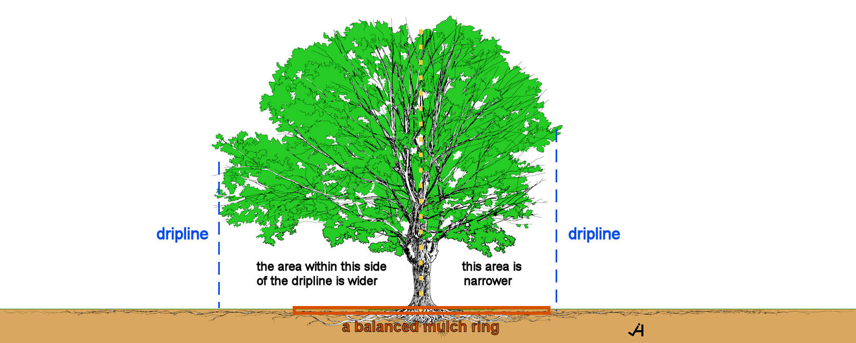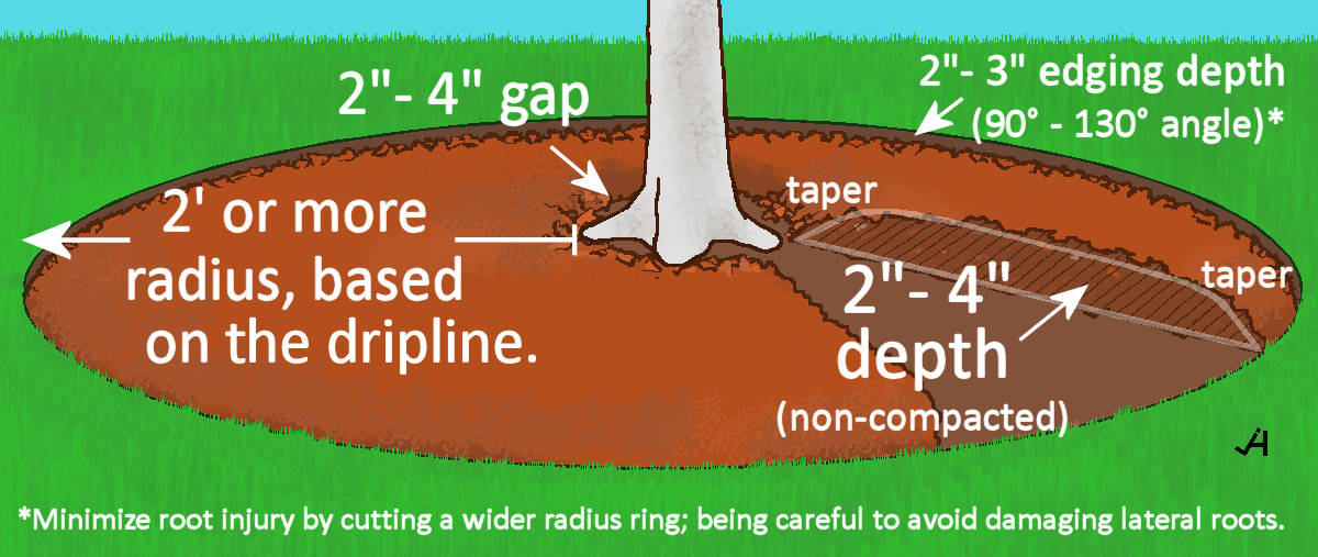 - Ensure proper depth by keeping the total mulch depth to a non-compacted 2″ to 4″, extending it out from the trunk based on the dripline.