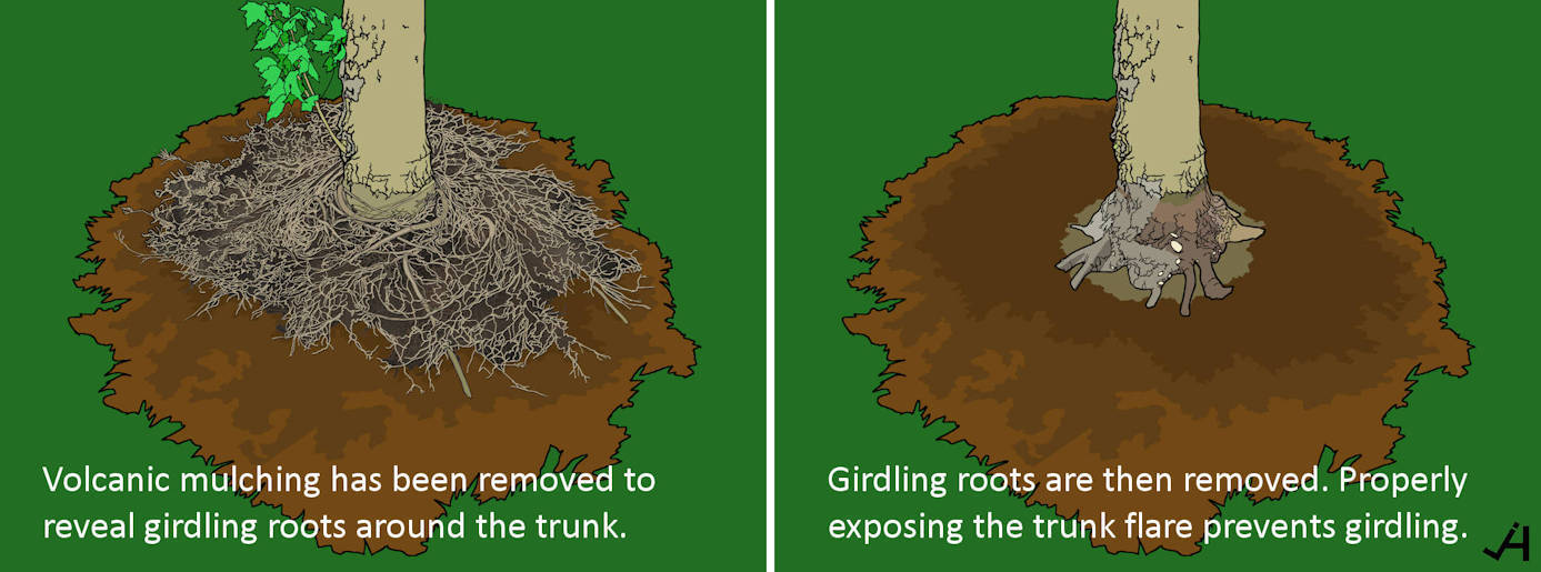 Removing volcanic mulch may reveal a surprising network of girdling roots! Seek professional advice before attempting to remove these girdling roots to minimize unnecessary injury to the tree.
