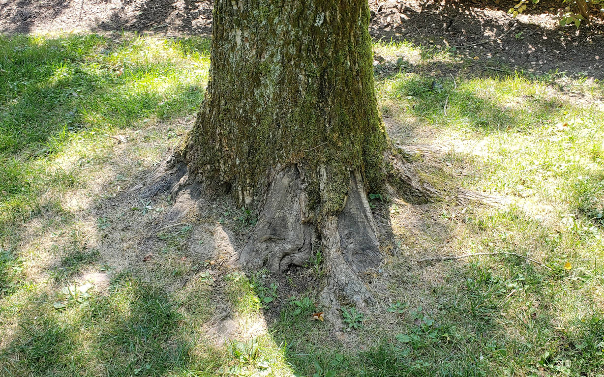 Lack of mulch around this mature tree resulted in the mower service severely damaging the trunk flare repeatedly over several years. This tree eventually died from these injuries and was taken down.