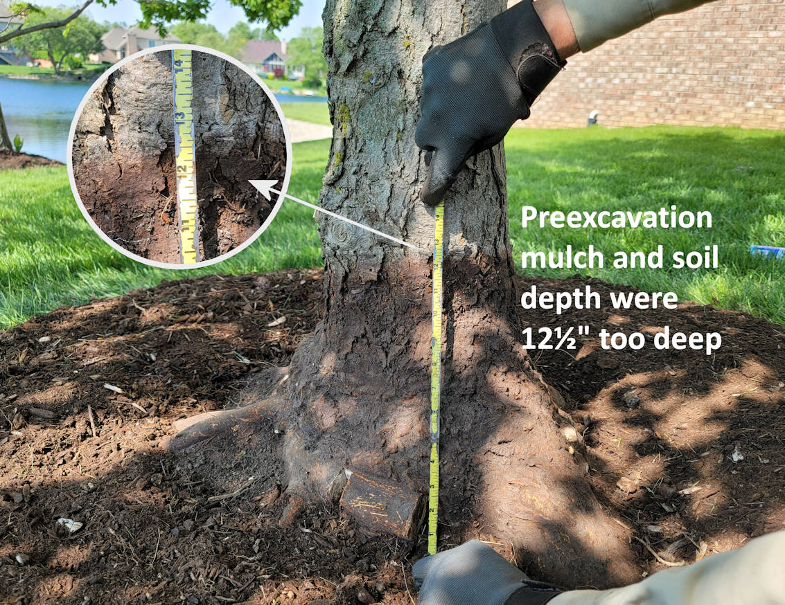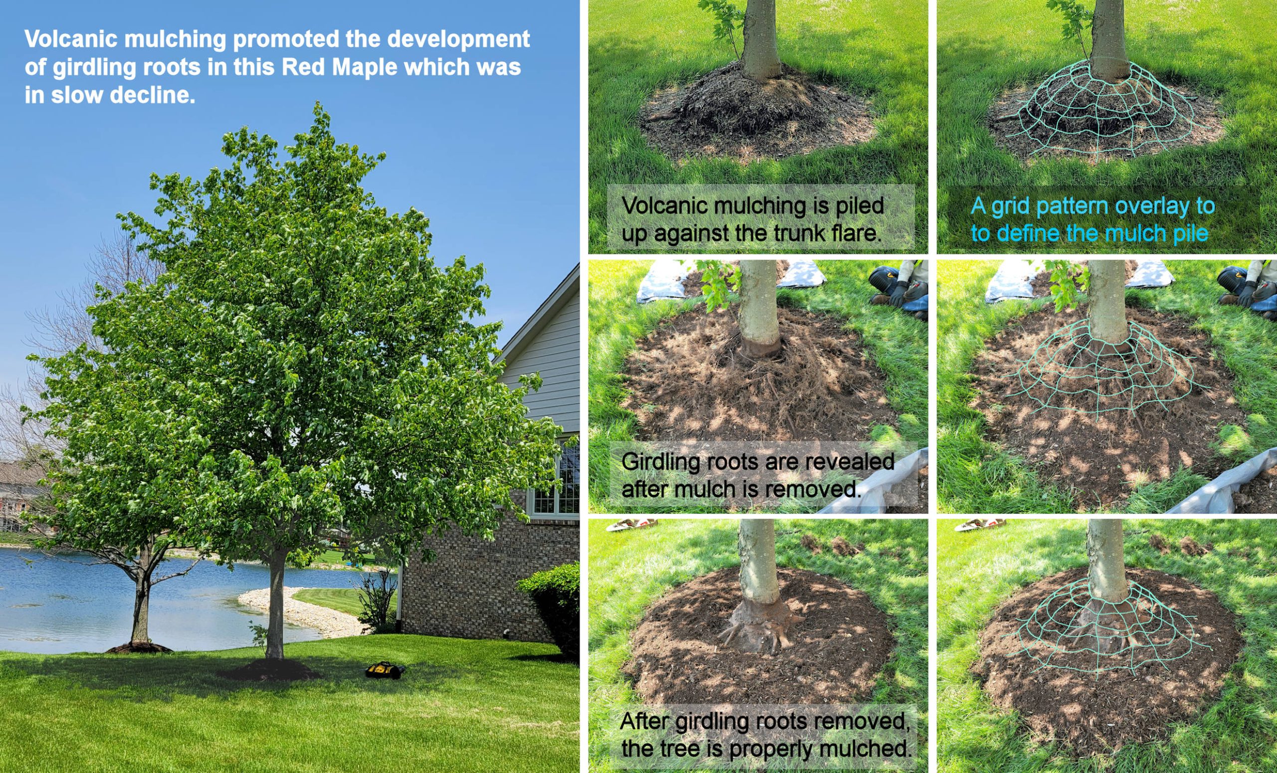 - Poor root growth: It encourages roots to grow into the mulch layer instead of spreading into the soil. These shallow, adventitious roots can then girdle the tree, strangling the root system and causing stress.